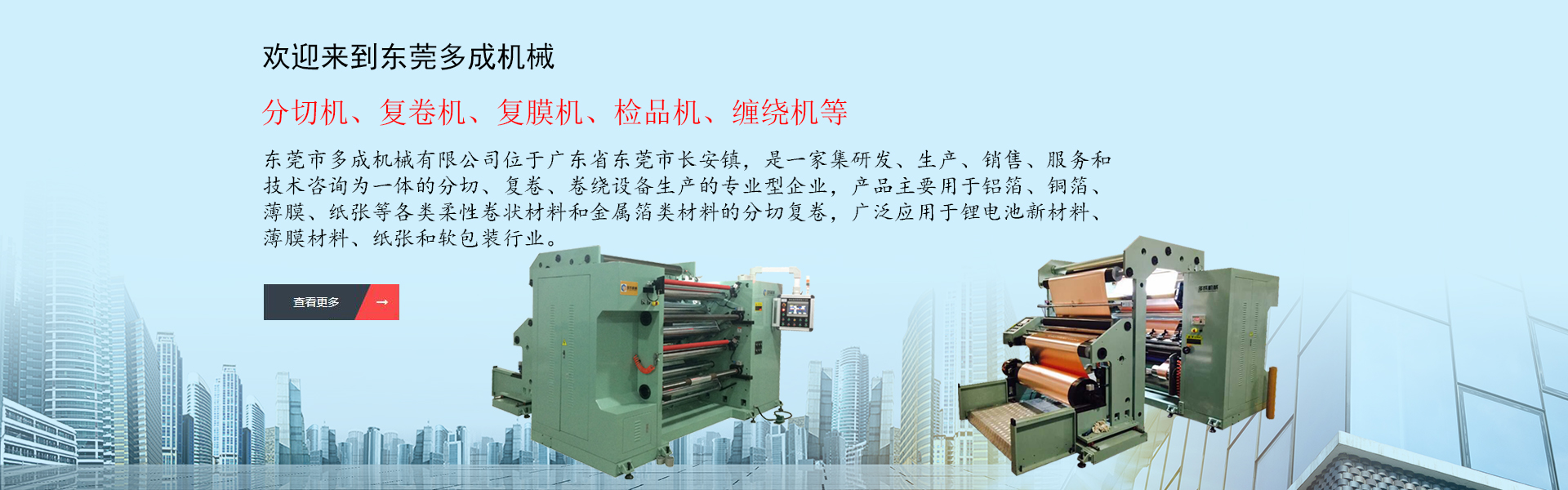 東莞市多成機械有限公司位于廣東省東莞市長安鎮(zhèn),是一家集研發(fā)、生產(chǎn)、銷售、服務和技術(shù)咨詢?yōu)橐惑w的分切、復卷、卷繞設備生產(chǎn)的專業(yè)型企業(yè),產(chǎn)品主要用于鋁箔、銅箔、薄膜、紙張等各類柔性卷狀材料和金屬箔類材料的分切復卷,廣泛應用于鋰電池新材料、薄膜材料、紙張和軟包裝行業(yè),產(chǎn)品范圍有分切機、復卷機、復膜機、檢品機、纏繞機等,是國內(nèi)外分切卷繞設備專業(yè)供應商。